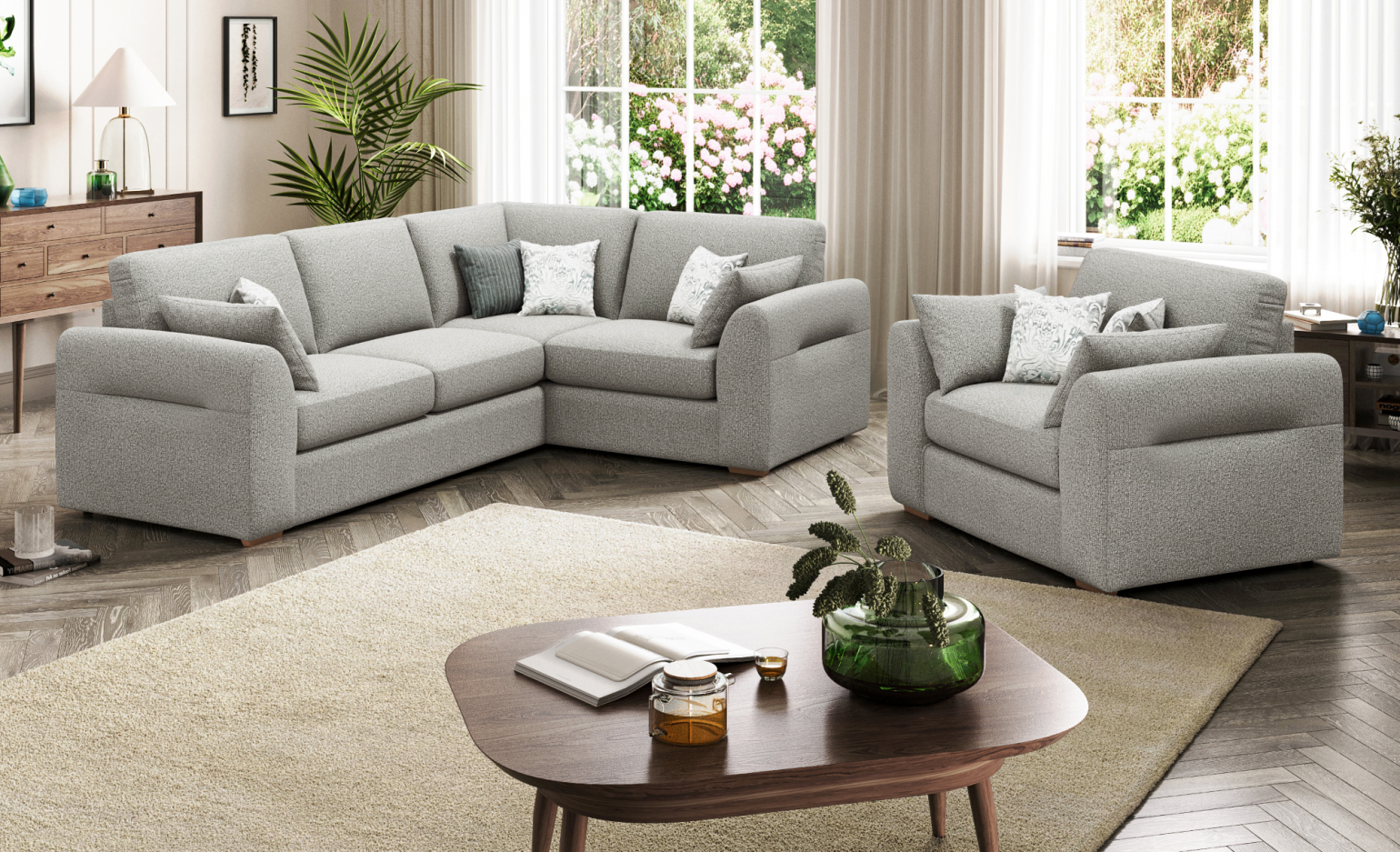 Experience the perfect blend of style and support with the Westwick sofa collection. The elegant, rolled armrests provide a soft, inviting touch, while pleated details on the sides add an extra layer of sophistication. The range is finished in a soft weave body fabric with contrasting patterned accent cushions and is available in four colour combinations. You can choose from a variety of sizes, from a spacious corner sofa to a cozy loveseat, and finish your piece with either oak or mahogany effect feet. Designed to stand the test of time, this entire range makes a bold statement in any room.